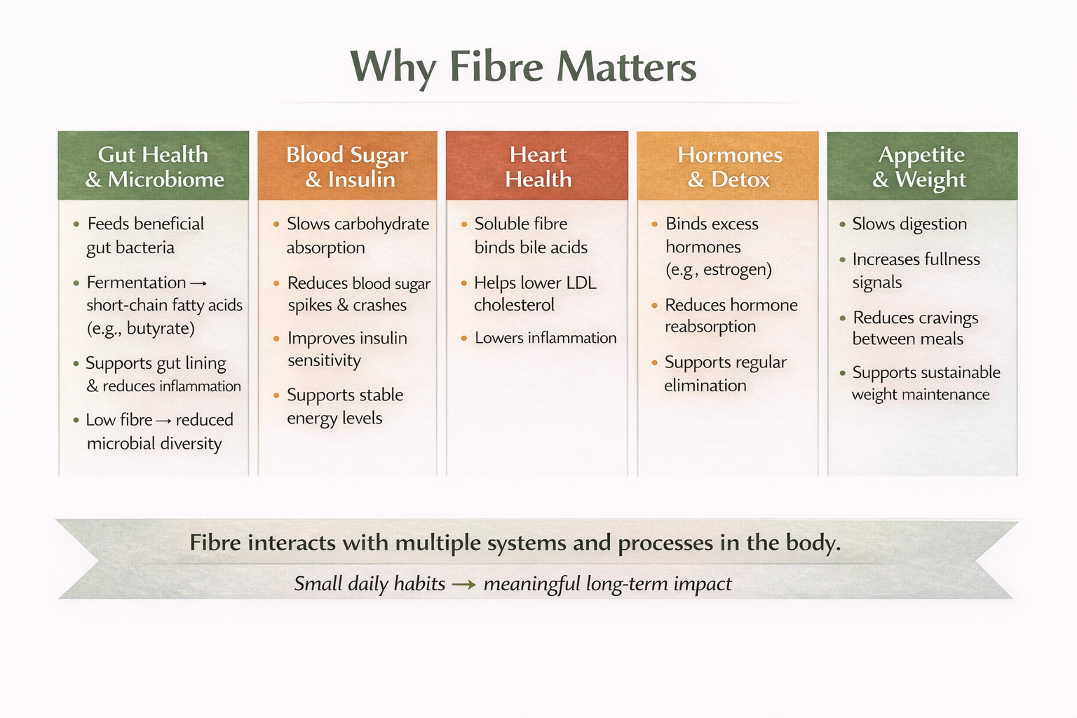 Fibre is not just about digestion, it is a cornerstone of metabolic, hormonal, and gut health. Consistently eating enough fibre supports long-term health, resilience, and balance across the body. Rather than viewing fibre as an afterthought, think of it as a daily foundation—one built through variety, whole foods, and sustainable habits.